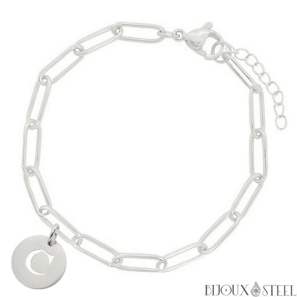 Découvrez notre chic bracelet à médaille lettre personnalisable sur chaîne trombone en acier inoxydable et disponible en doré ou argenté. Personnalisez la médaille ronde avec l'une des 26 lettres de votre choix: L'initiale de votre prénom, celle de votre maman ou encore votre âme soeur!