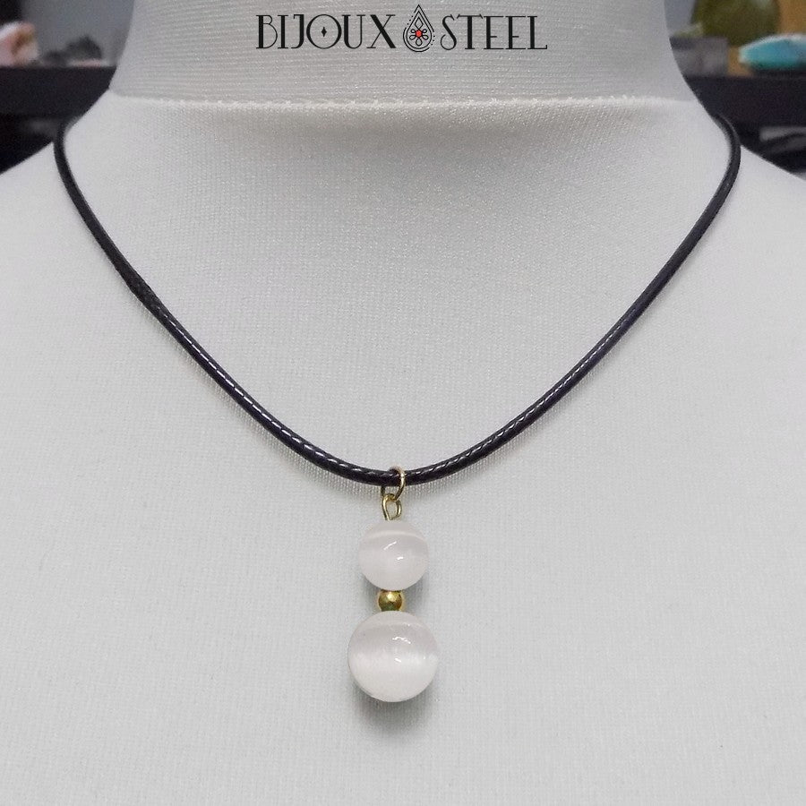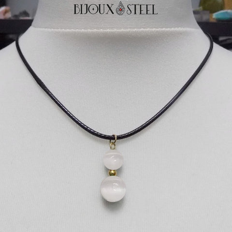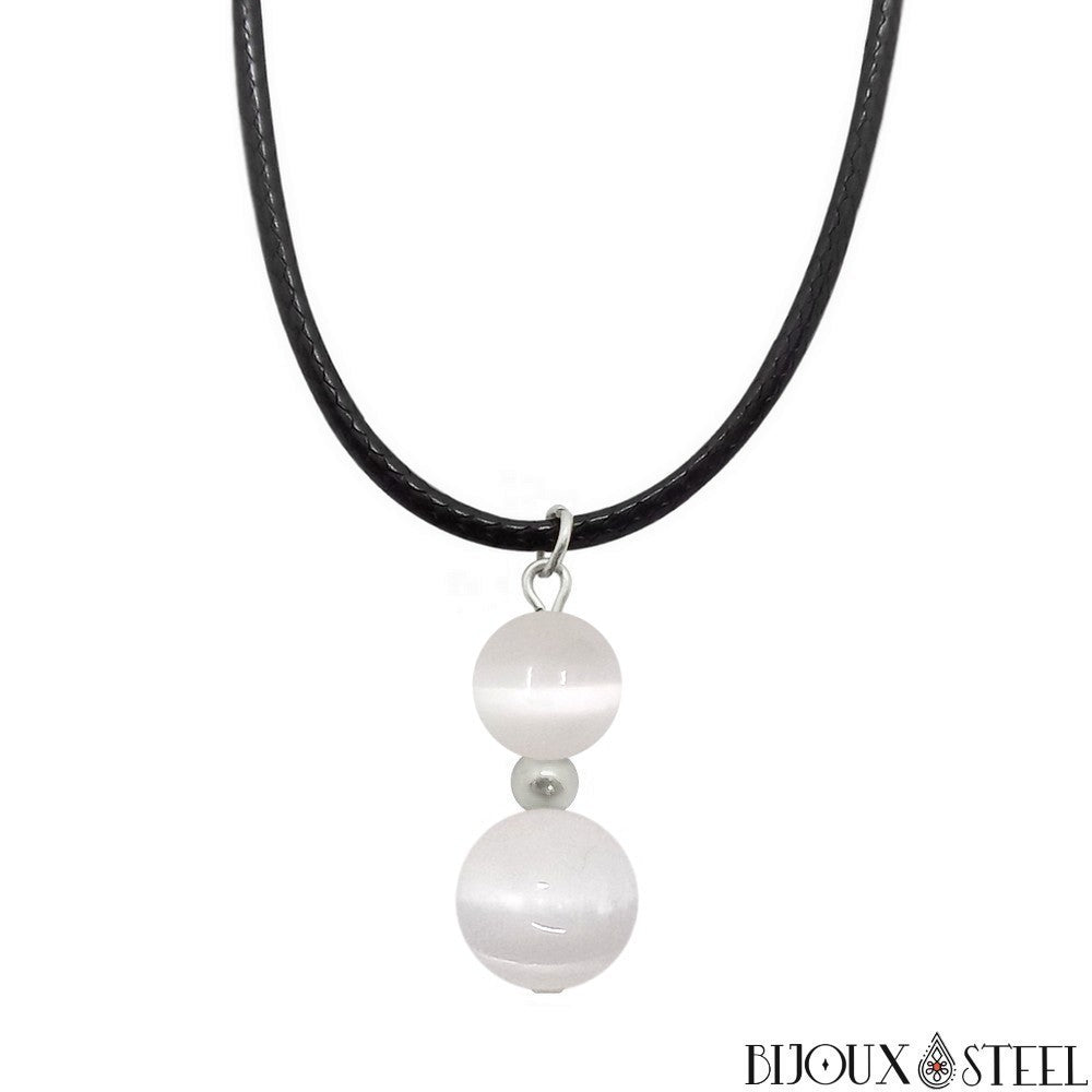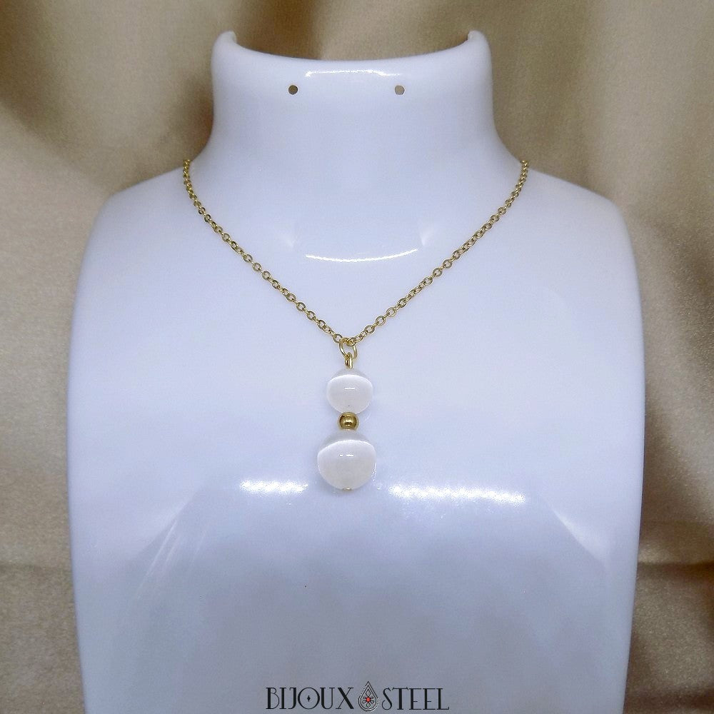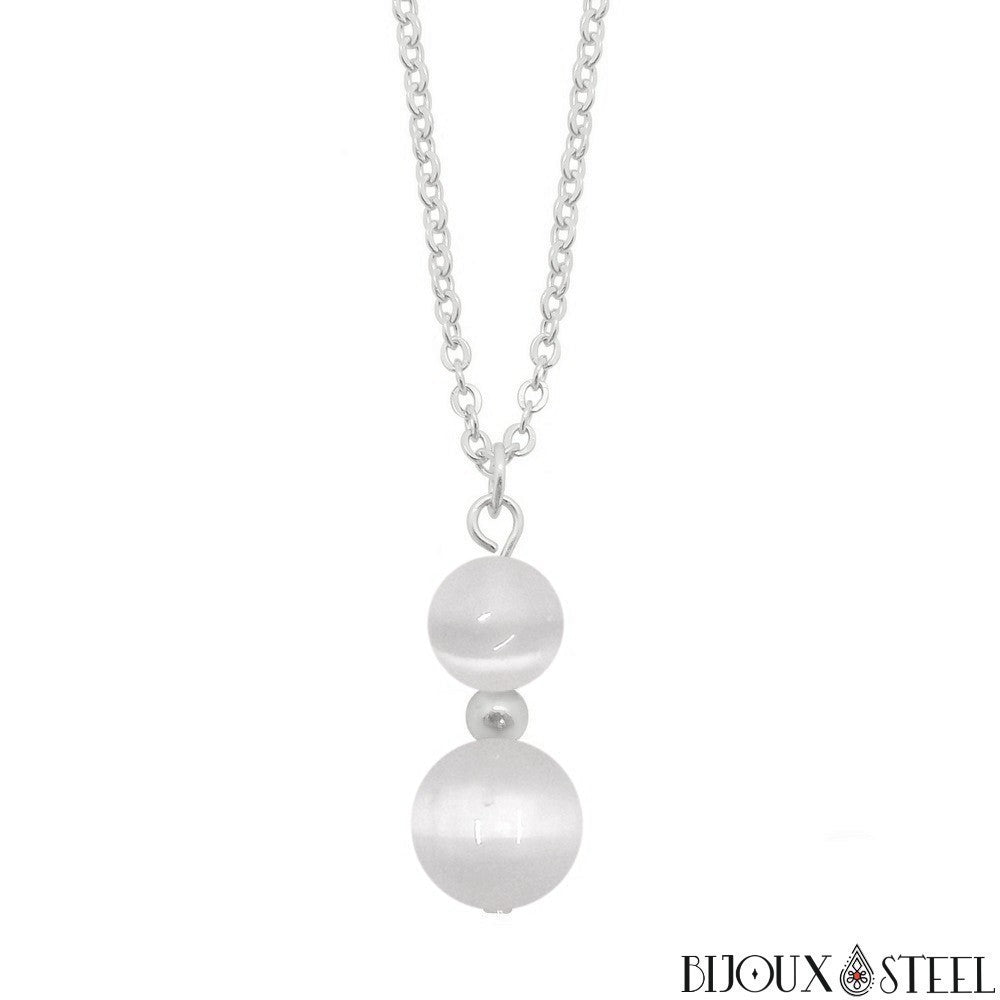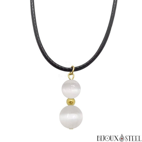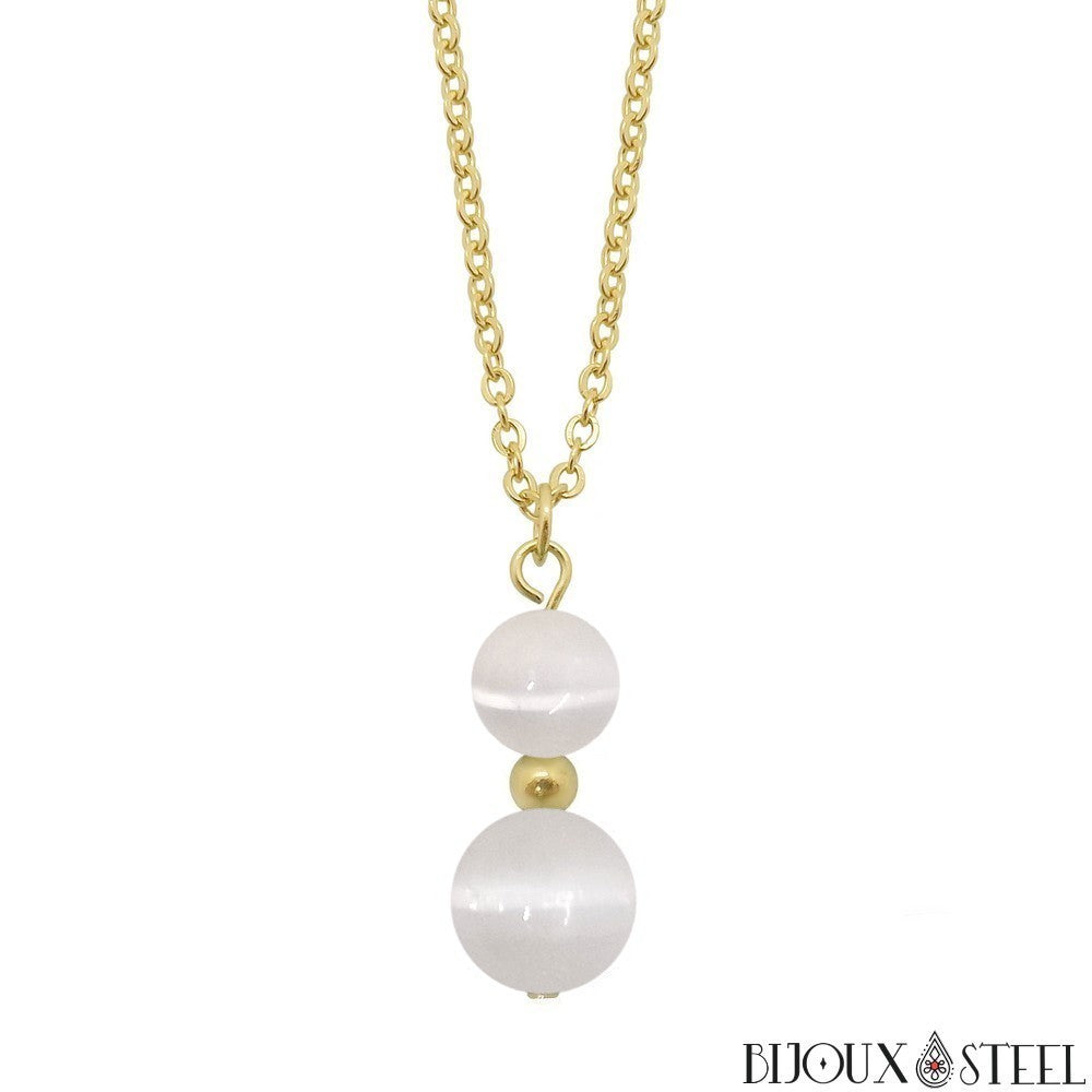 Si vous appréciez l'élégance des bijoux faits main en pierres naturelles, ou pratiquez la lithothérapie pour votre bien être, retrouvez notre collier à pendentif deux perles de sélénite en pierre naturelle et acier inoxydable.